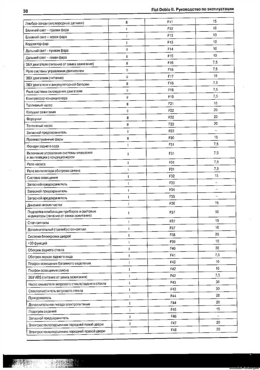 Итак, где можно найти схему предохранителей Фиат Добло? Обычно она находится в разделе, посвященном электрическим компонентам и предохранителям, в инструкции по эксплуатации автомобиля. На схеме предохранителей обычно указывается, какие предохранители отвечают за какие устройства. Это может включать в себя такие компоненты, как фары, стеклоподъемники, систему кондиционирования воздуха и другие.